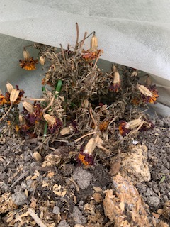 冬の終わり、私の菜園では、昨年咲いたマリーゴールドの花がカサカサに枯れてきました。