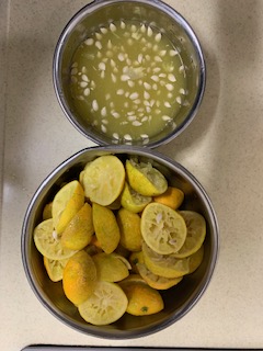1.すだちを洗って半分に切り、果汁を絞ります。